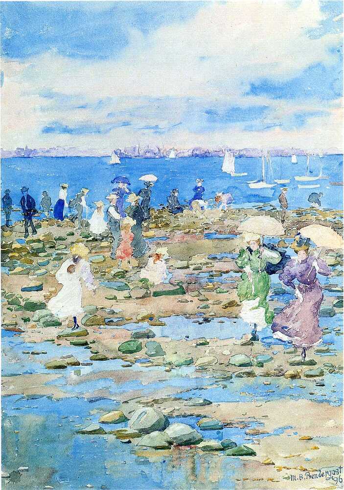 Nous vous proposons une reproduction artisanale sur toile du célèbre tableau 'Visiteurs d'été' de Maurice Prendergast, provenant du Musée de la Reproduction.