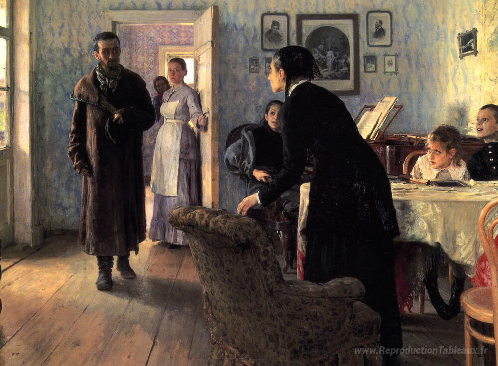 Nous vous proposons une reproduction artisanale sur toile du célèbre tableau 'Visiteurs inattendus' de Ilya Repin, provenant du Musée de la Reproduction.