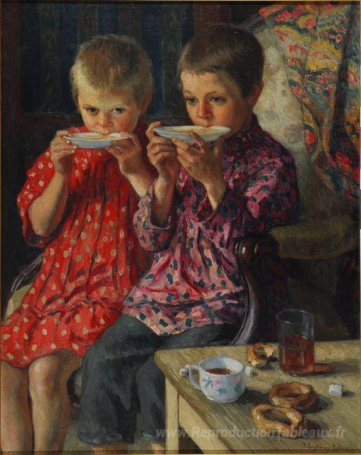 Nous vous proposons une reproduction artisanale sur toile du célèbre tableau 'Visiteurs' de Nikolay Bogdanov-Belsky, provenant du Musée de la Reproduction.