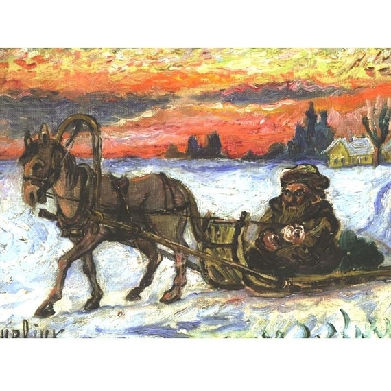 Nous vous proposons une reproduction artisanale sur toile du célèbre tableau 'Voyageur d'hiver (coucher de soleil)' de David Burliuk, provenant du Musée de la Reproduction.