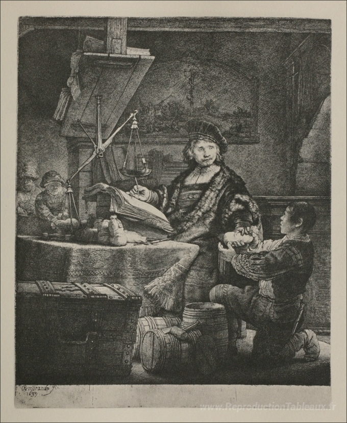 Nous vous proposons une reproduction artisanale sur toile du célèbre tableau 'Wittenboogaert, le pesée d'or' de Rembrandt, provenant du Musée de la Reproduction.