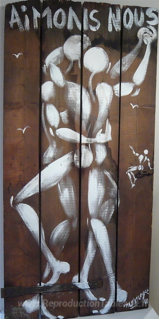 Nous vous proposons une reproduction artisanale sur toile du célèbre tableau 'Aimons-nous' de Jerome Mesnager, provenant du Musée de la Reproduction.