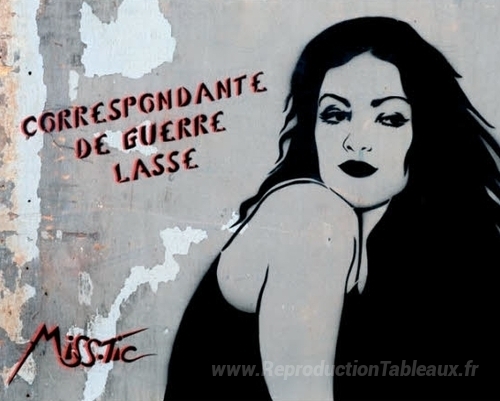Nous vous proposons une reproduction artisanale sur toile du célèbre tableau 'Correspondante de guerre lasse' de Miss.Tic, provenant du Musée de la Reproduction.