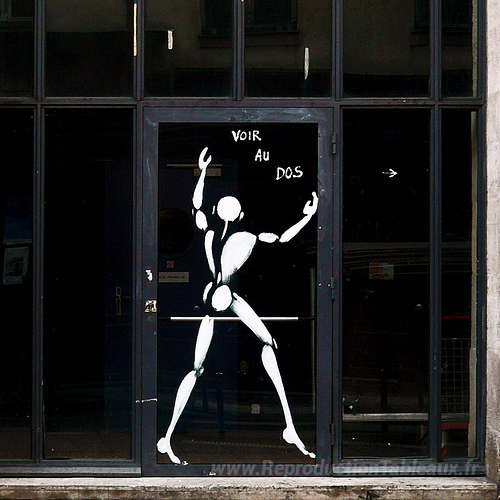 Nous vous proposons une reproduction artisanale sur toile du célèbre tableau 'Voir au dos' de Jerome Mesnager, provenant du Musée de la Reproduction.