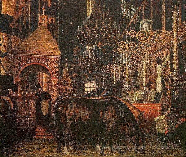 Nous vous proposons une reproduction artisanale sur toile du célèbre tableau 'À la cathédrale de l'hypothèse' de Vasily Vereshchagin, provenant du Musée de la Reproduction.