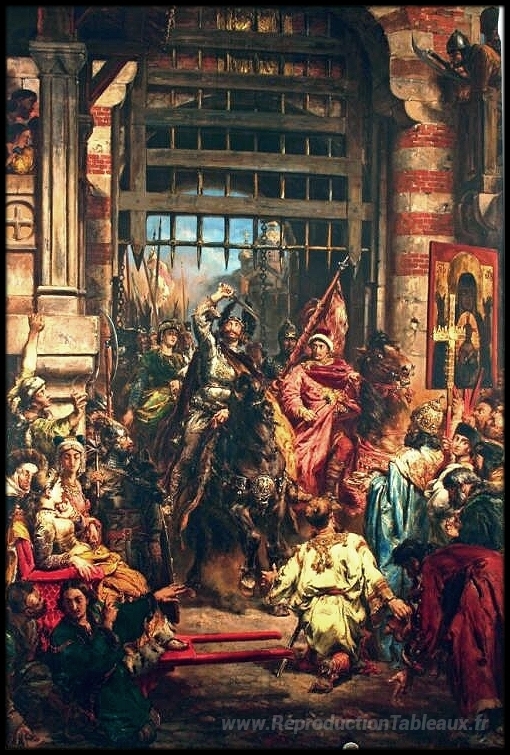 Nous vous proposons une reproduction artisanale sur toile du célèbre tableau 'Boleslaw le courageux avec Sviatopolk au Golden Gate à Kiev' de Jan Matejko, provenant du Musée de la Reproduction.