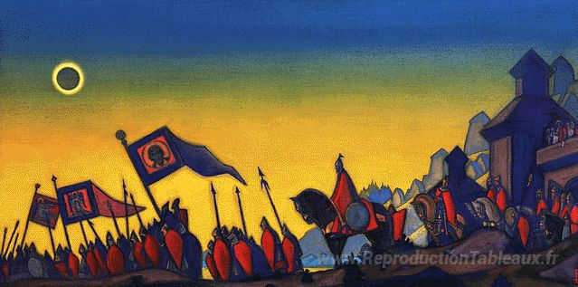 Nous vous proposons une reproduction artisanale sur toile du célèbre tableau 'Campagne du prince Igor' de Nicholas Roerich, provenant du Musée de la Reproduction.