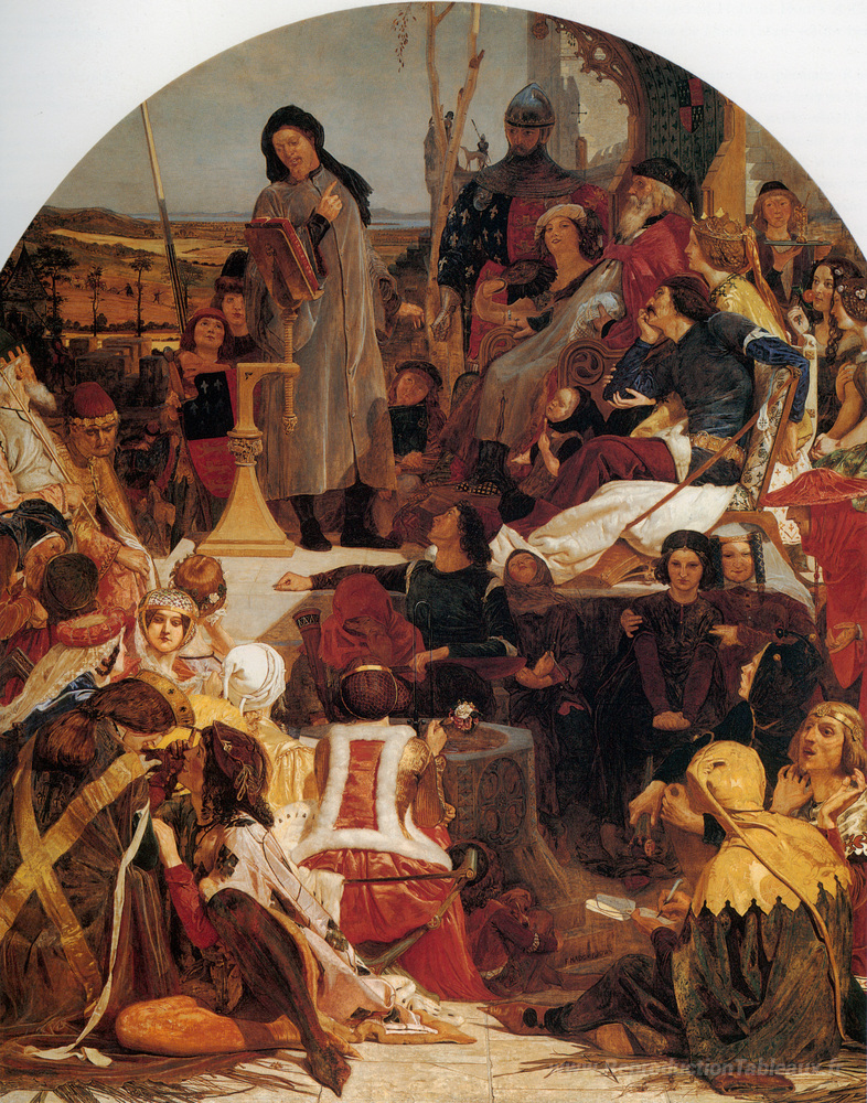 Nous vous proposons une reproduction artisanale sur toile du célèbre tableau 'Chaucer à la cour d'Edouard III' de Ford Madox Brown, provenant du Musée de la Reproduction.