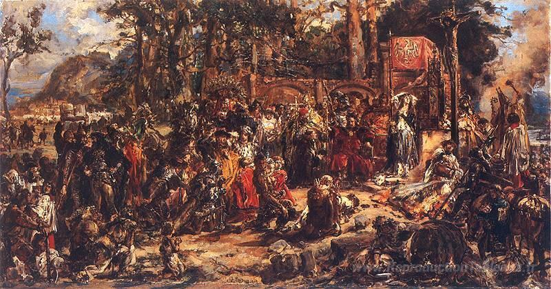 Nous vous proposons une reproduction artisanale sur toile du célèbre tableau 'Christianisation de la Lituanie et 1387' de Jan Matejko, provenant du Musée de la Reproduction.