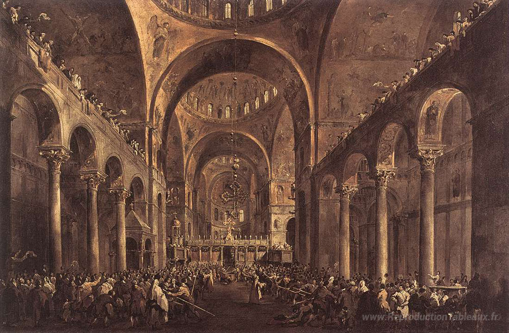 Nous vous proposons une reproduction artisanale sur toile du célèbre tableau 'Doge Alvise IV Mocenigo apparaît aux habitants de la basilique S' de Francesco Guardi, provenant du Musée de la Reproduction.