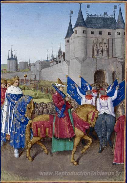 Nous vous proposons une reproduction artisanale sur toile du célèbre tableau 'Entrée de Charles V à Paris' de Jean Fouquet, provenant du Musée de la Reproduction.