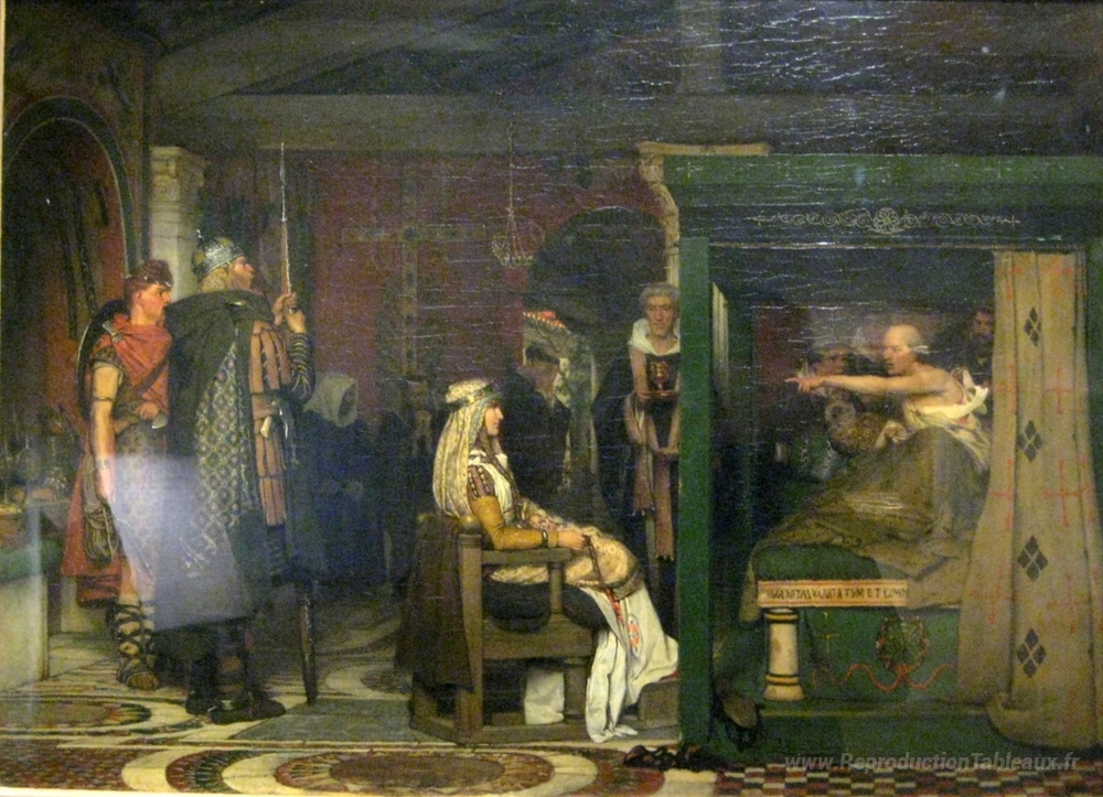 Nous vous proposons une reproduction artisanale sur toile du célèbre tableau 'Fredegunda praetextatus visite sur son lit de mort' de Sir Lawrence Alma-Tadema, provenant du Musée de la Reproduction.