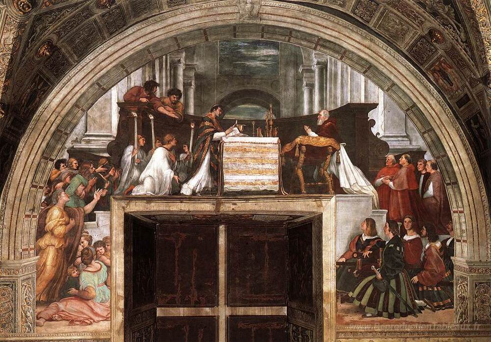 Nous vous proposons une reproduction artisanale sur toile du célèbre tableau 'La masse de Bolsena, de la strophe dell'eliodor' de Raphael, provenant du Musée de la Reproduction.
