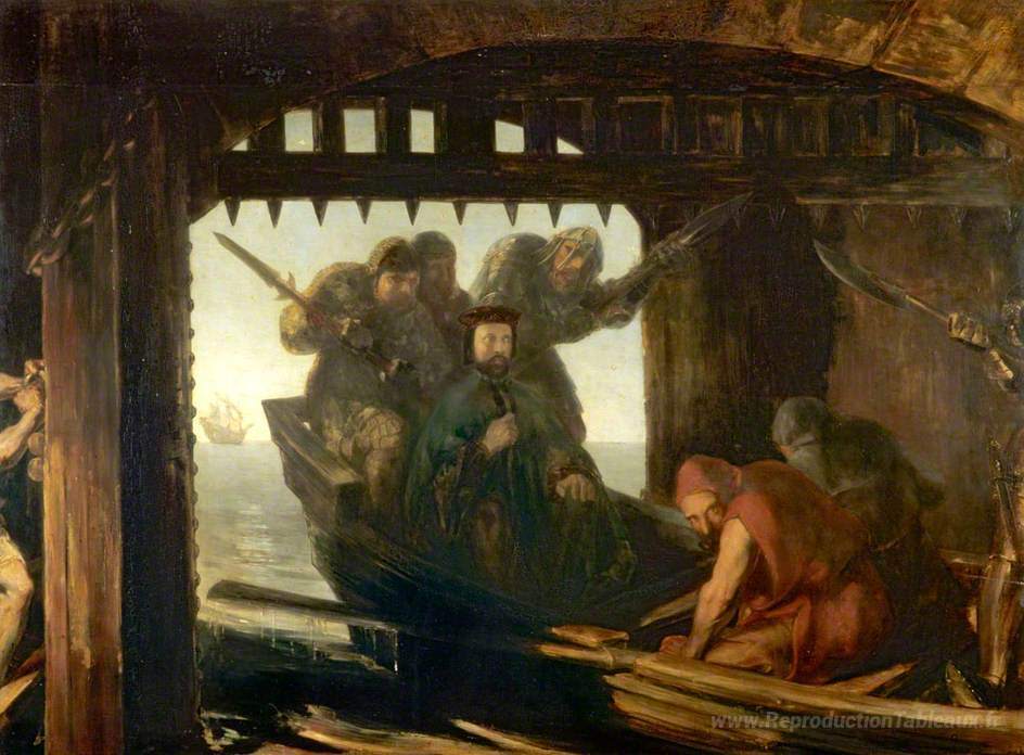 Nous vous proposons une reproduction artisanale sur toile du célèbre tableau 'La porte du traître' de David Scott, provenant du Musée de la Reproduction.