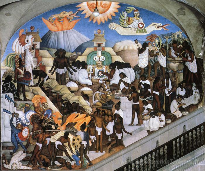 Nous vous proposons une reproduction artisanale sur toile du célèbre tableau 'L'ancien monde indien' de Diego Rivera, provenant du Musée de la Reproduction.
