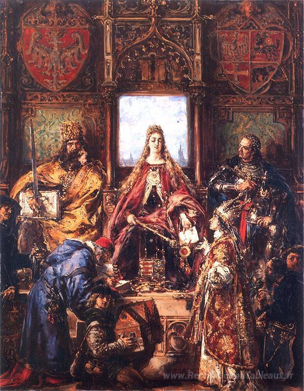 Nous vous proposons une reproduction artisanale sur toile du célèbre tableau 'Le mariage de Jadwiga et Jagiello' de Jan Matejko, provenant du Musée de la Reproduction.