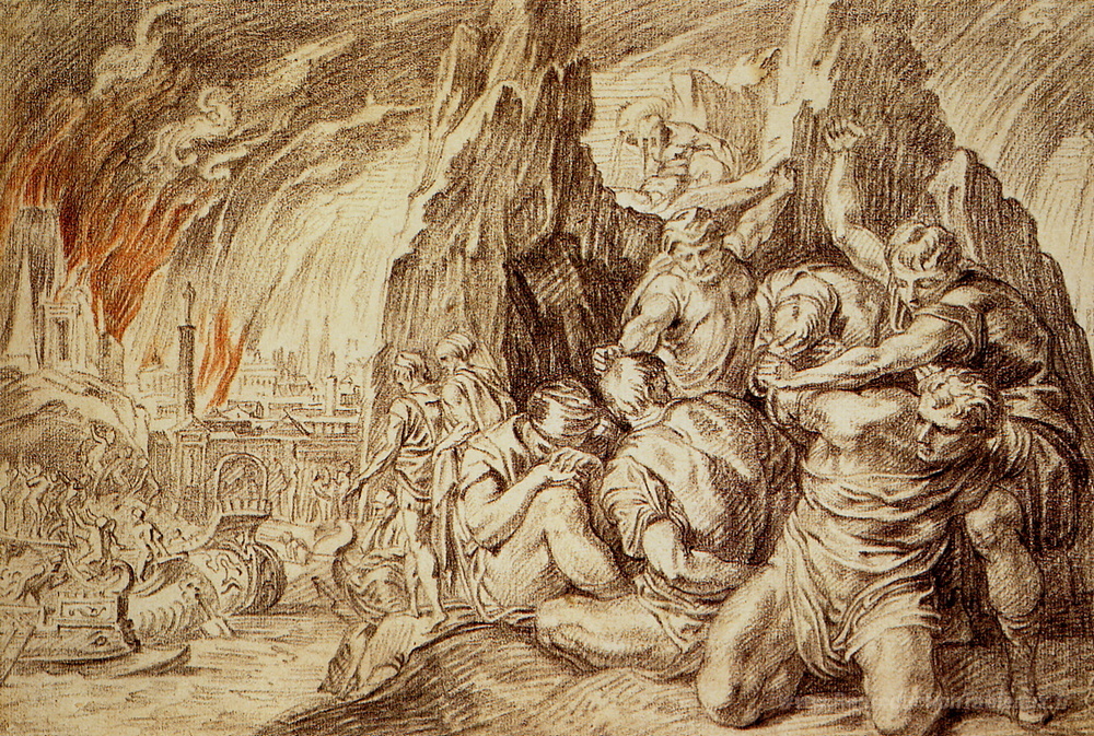 Nous vous proposons une reproduction artisanale sur toile du célèbre tableau 'Les Grecs partent après le feu de Troy' de Theodoor van Thulden, provenant du Musée de la Reproduction.