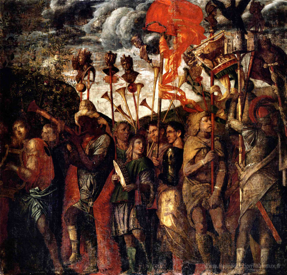 Nous vous proposons une reproduction artisanale sur toile du célèbre tableau 'Musiciens et enseigne les transporteurs' de Andrea Mantegna, provenant du Musée de la Reproduction.