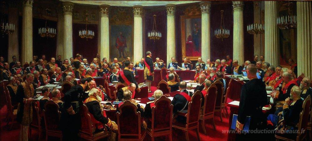 Nous vous proposons une reproduction artisanale sur toile du célèbre tableau 'Réunion de cérémonie du Conseil d'État le 7 mai 1901' de Ilya Repin, provenant du Musée de la Reproduction.