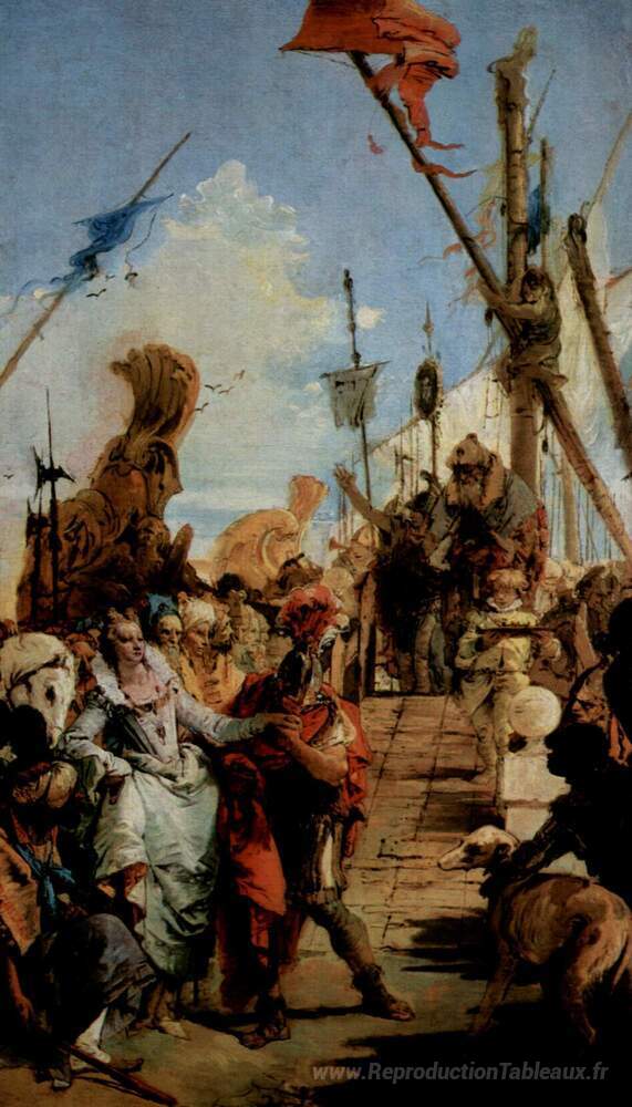 Nous vous proposons une reproduction artisanale sur toile du célèbre tableau 'Réunion de Marc Anthony et Cléopâtre' de Giovanni Battista Tiepolo, provenant du Musée de la Reproduction.