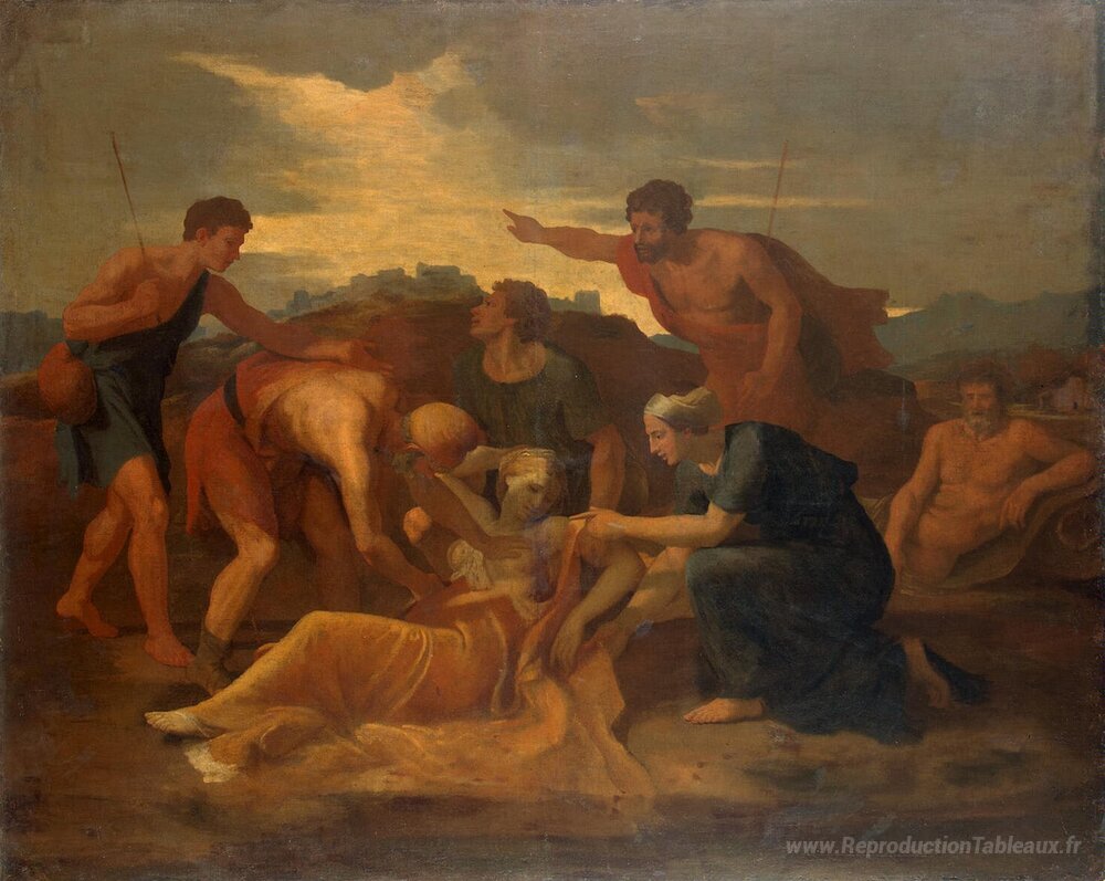 Nous vous proposons une reproduction artisanale sur toile du célèbre tableau 'Reine Zenobia trouvé sur les rives de l'Arax' de Nicolas Poussin, provenant du Musée de la Reproduction.
