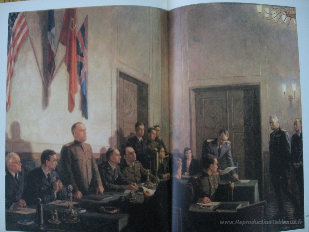 Nous vous proposons une reproduction artisanale sur toile du célèbre tableau 'Signer l'acte de reddition inconditionnelle de l'Allemagne' de Kukryniksy, provenant du Musée de la Reproduction.