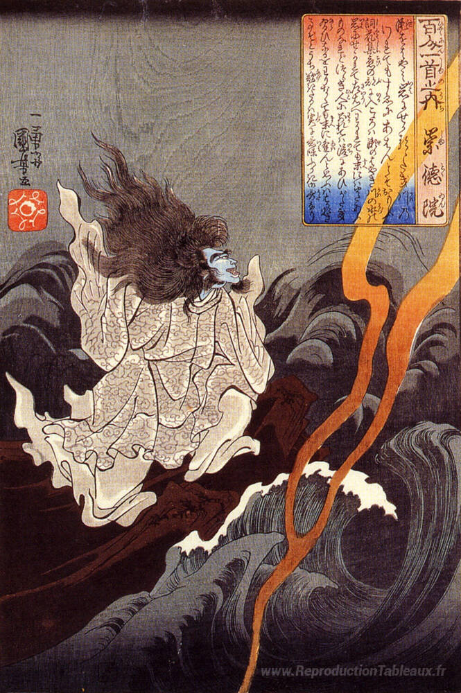Nous vous proposons une reproduction artisanale sur toile du célèbre tableau 'Sotoku invoquant une tempête de tonnerre' de Utagawa Kuniyoshi, provenant du Musée de la Reproduction.