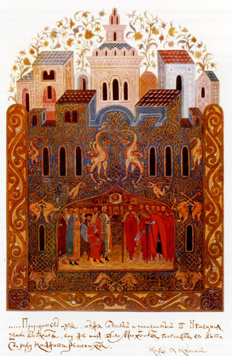 Nous vous proposons une reproduction artisanale sur toile du célèbre tableau 'Arrivée du prince Michael Glanda Kambila en Russie, Veliky Novgo' de Nicholas Roerich, provenant du Musée de la Reproduction.