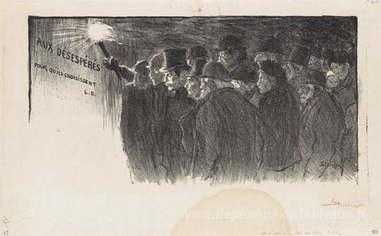Nous vous proposons une reproduction artisanale sur toile du célèbre tableau 'Aux Desesperes verse qu-ils choissente' de Theophile Steinlen, provenant du Musée de la Reproduction.