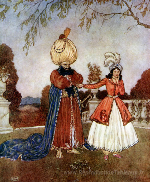 Nous vous proposons une reproduction artisanale sur toile du célèbre tableau 'Bluebeard - du livre d'images pour la Croix-Rouge' de Edmund Dulac, provenant du Musée de la Reproduction.