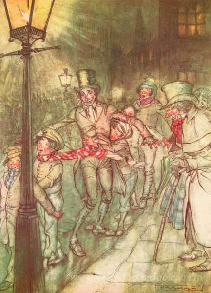 Nous vous proposons une reproduction artisanale sur toile du célèbre tableau 'Bob Cratchit a descendu une glissière sur Cornhill' de Arthur Rackham, provenant du Musée de la Reproduction.