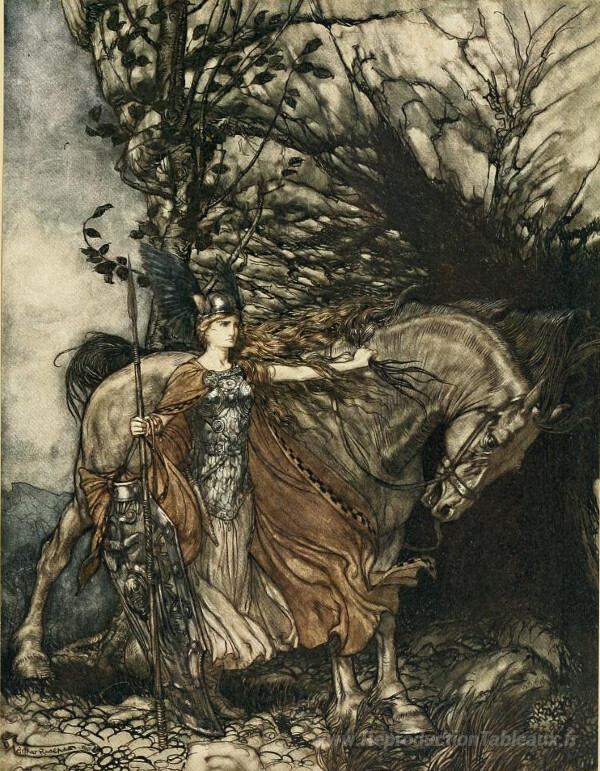 Nous vous proposons une reproduction artisanale sur toile du célèbre tableau 'Brünnhilde avec son cheval, à l'embouchure de la grotte' de Arthur Rackham, provenant du Musée de la Reproduction.