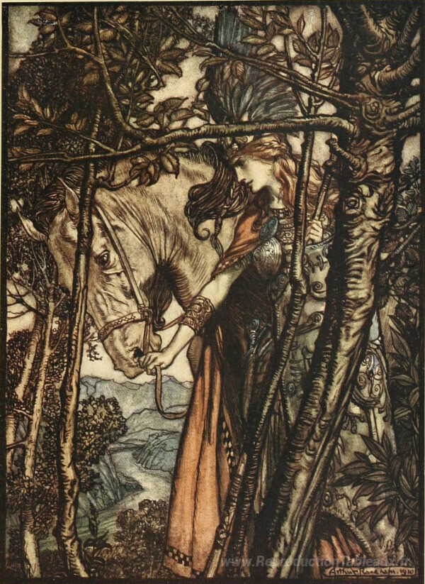 Nous vous proposons une reproduction artisanale sur toile du célèbre tableau 'Brünnhilde conduit lentement et silencieusement son cheval sur l' de Arthur Rackham, provenant du Musée de la Reproduction.