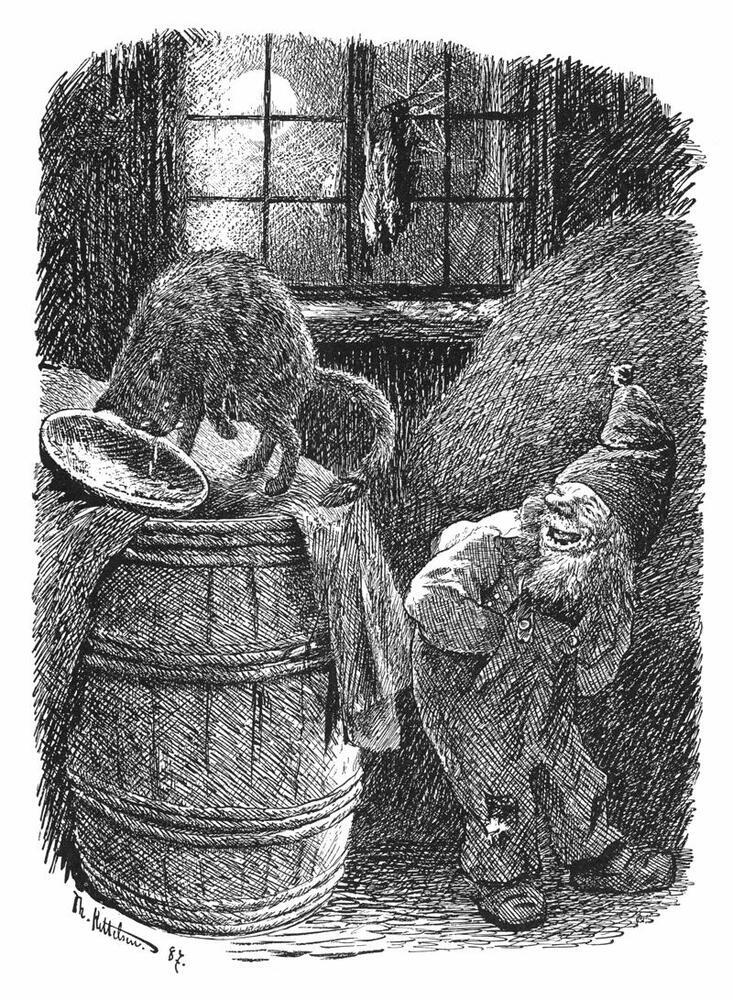 Nous vous proposons une reproduction artisanale sur toile du célèbre tableau 'Brownie se moque du chat' de Theodor Severin Kittelsen, provenant du Musée de la Reproduction.