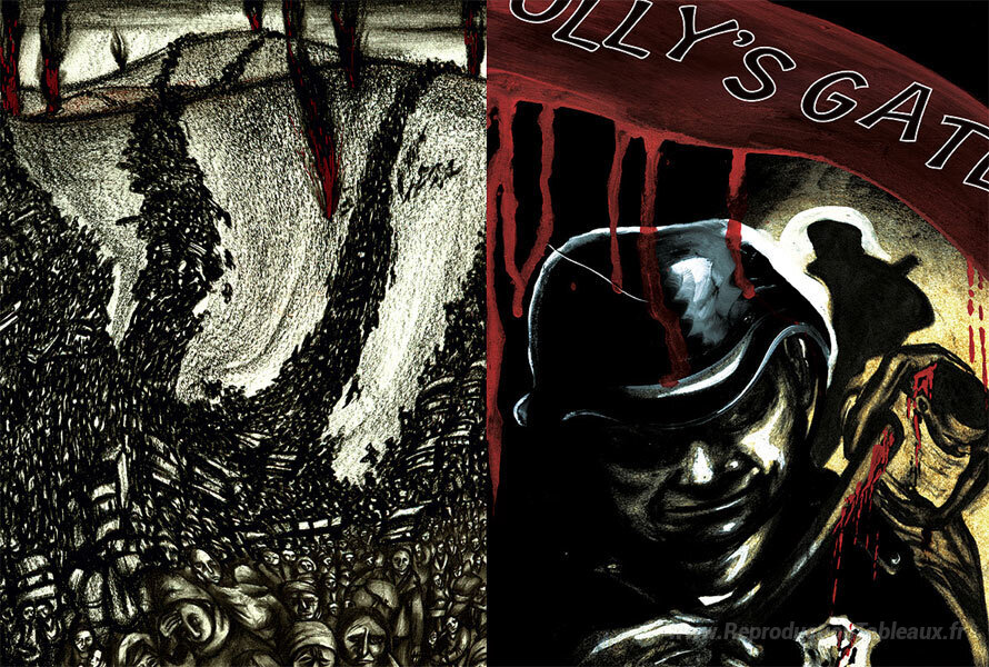 Nous vous proposons une reproduction artisanale sur toile du célèbre tableau 'Bullygate' de Sue Coe, provenant du Musée de la Reproduction.