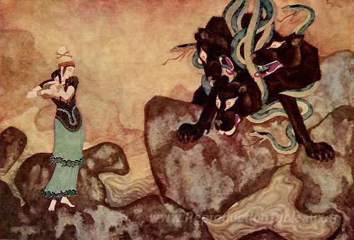 Nous vous proposons une reproduction artisanale sur toile du célèbre tableau 'Cerburus, The Black Dog of Hadès - du livre d'images pour la Cro' de Edmund Dulac, provenant du Musée de la Reproduction.