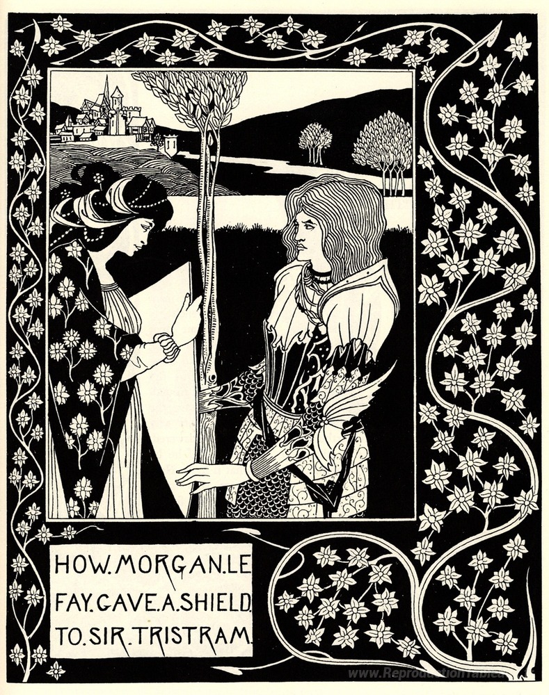 Nous vous proposons une reproduction artisanale sur toile du célèbre tableau 'Comment Morgan Le Fay a donné un bouclier à Sir Tristram' de Aubrey Beardsley, provenant du Musée de la Reproduction.
