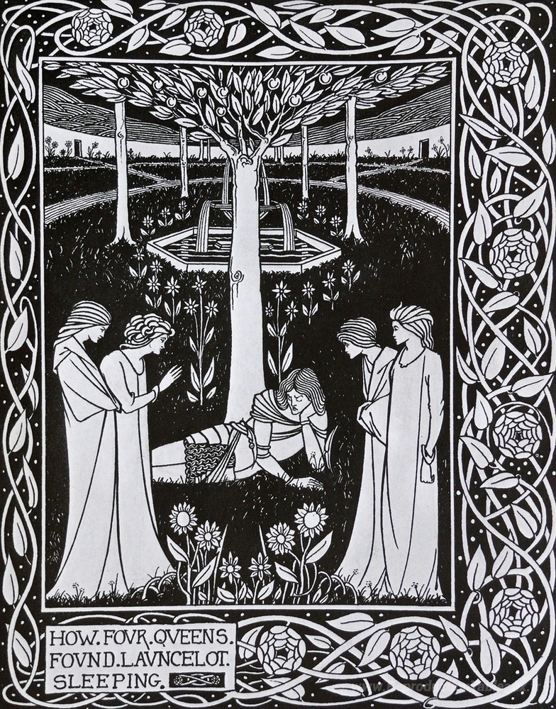 Nous vous proposons une reproduction artisanale sur toile du célèbre tableau 'Comment quatre reines ont trouvé Launcelot Sleeping' de Aubrey Beardsley, provenant du Musée de la Reproduction.