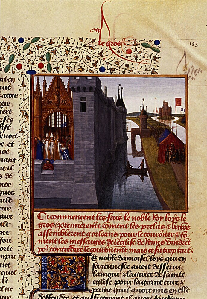 Nous vous proposons une reproduction artisanale sur toile du célèbre tableau 'Couronnement de Louis VI' de Jean Fouquet, provenant du Musée de la Reproduction.