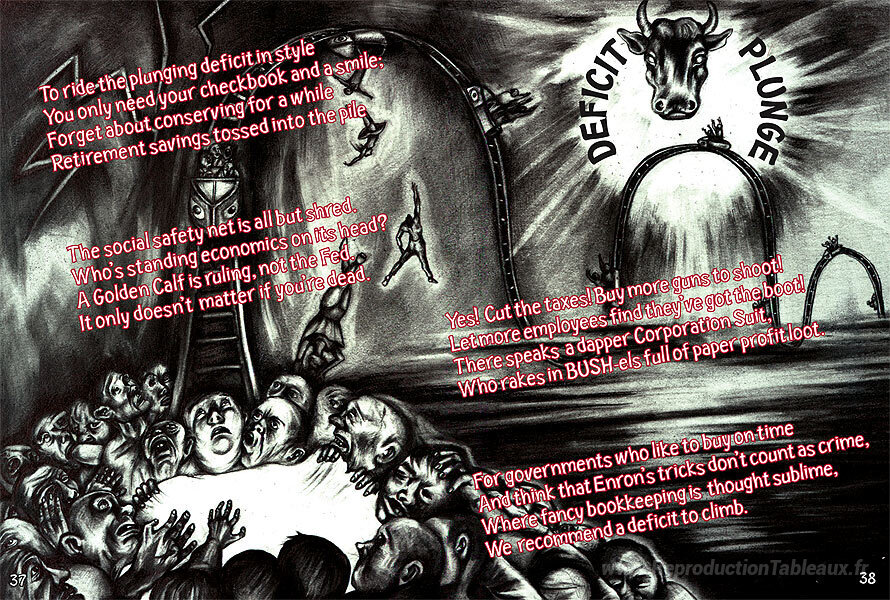 Nous vous proposons une reproduction artisanale sur toile du célèbre tableau 'Déficit' de Sue Coe, provenant du Musée de la Reproduction.