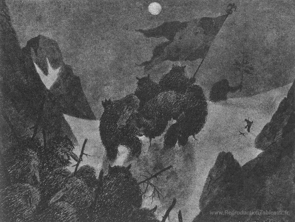 Nous vous proposons une reproduction artisanale sur toile du célèbre tableau 'De hadde i otost' de Theodor Severin Kittelsen, provenant du Musée de la Reproduction.