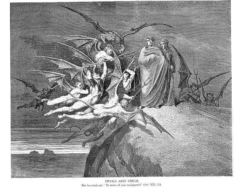 Nous vous proposons une reproduction artisanale sur toile du célèbre tableau 'Devils et Virgile' de Gustave Dore, provenant du Musée de la Reproduction.