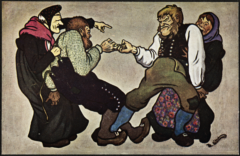 Nous vous proposons une reproduction artisanale sur toile du célèbre tableau 'Dumme menn og troll jusqu'à Kjerringer' de Theodor Severin Kittelsen, provenant du Musée de la Reproduction.