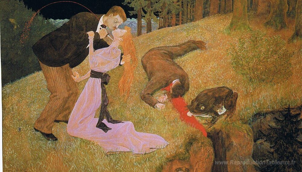 Nous vous proposons une reproduction artisanale sur toile du célèbre tableau 'Eifersucht' de Thomas Theodor Heine, provenant du Musée de la Reproduction.
