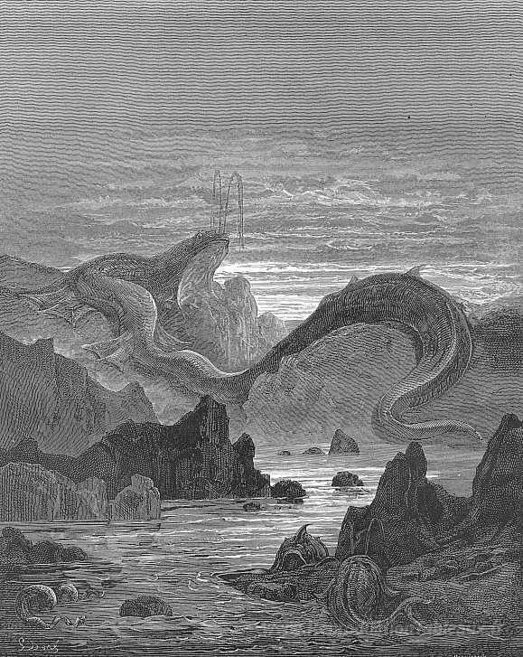 Nous vous proposons une reproduction artisanale sur toile du célèbre tableau 'Et semble être une terre émouvante et à ses branchies s'approche' de Gustave Dore, provenant du Musée de la Reproduction.