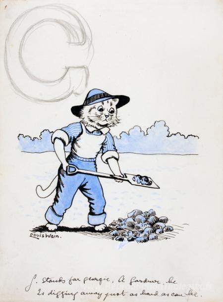 Nous vous proposons une reproduction artisanale sur toile du célèbre tableau 'G signifie Georgie, un jardinier. Il creuse aussi fort que possi' de Louis Wain, provenant du Musée de la Reproduction.