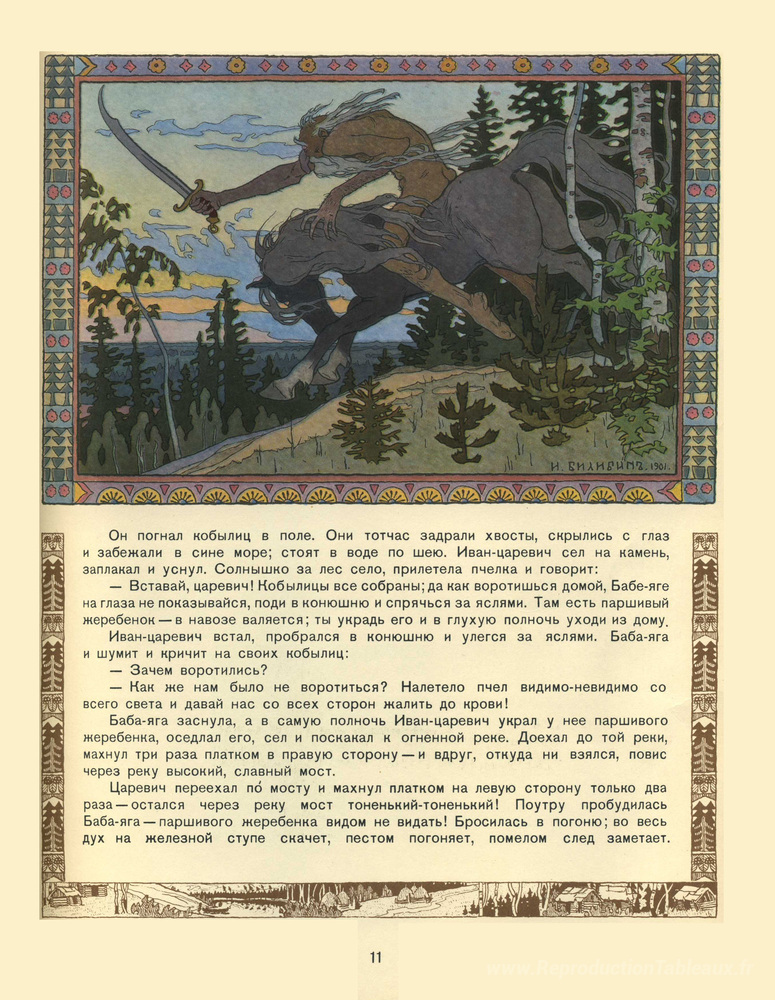Nous vous proposons une reproduction artisanale sur toile du célèbre tableau 'Illustration de l'histoire de la fée russe "Maria Morevna"' de Ivan Bilibin, provenant du Musée de la Reproduction.