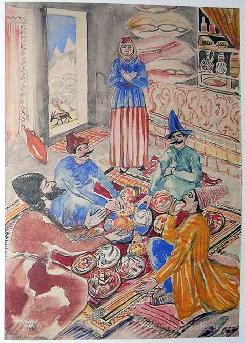 Nous vous proposons une reproduction artisanale sur toile du célèbre tableau 'Illustration des «contes folkloriques arméniens»' de Martiros Saryan, provenant du Musée de la Reproduction.