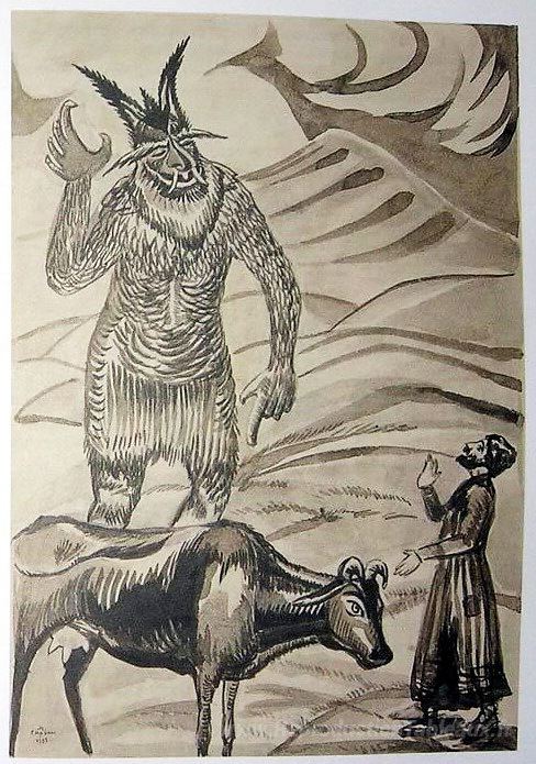 Nous vous proposons une reproduction artisanale sur toile du célèbre tableau 'Illustration des «contes folkloriques arméniens»' de Martiros Saryan, provenant du Musée de la Reproduction.