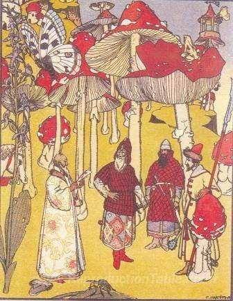 Nous vous proposons une reproduction artisanale sur toile du célèbre tableau 'Illustration du conte de fées «La guerre des champignons»' de Heorhiy Narbut, provenant du Musée de la Reproduction.